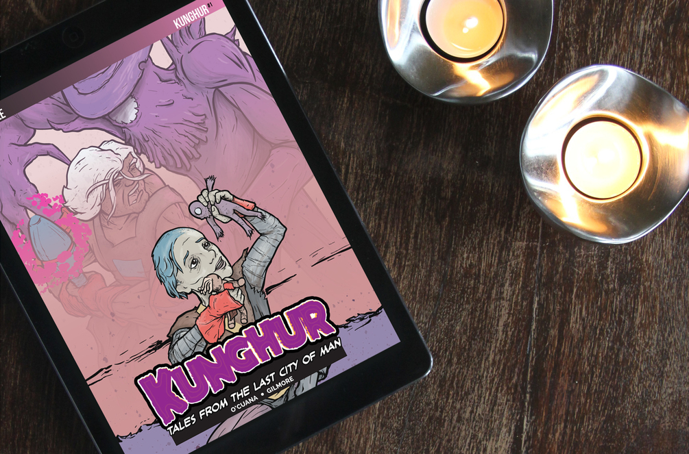 Kunghur | Tales from the Last City of Man #1 is a 16-page story riffing on the action figure fantasy comics produced in the 1980s. Story by Emmet O’Cuana, art by Dan Gilmore.